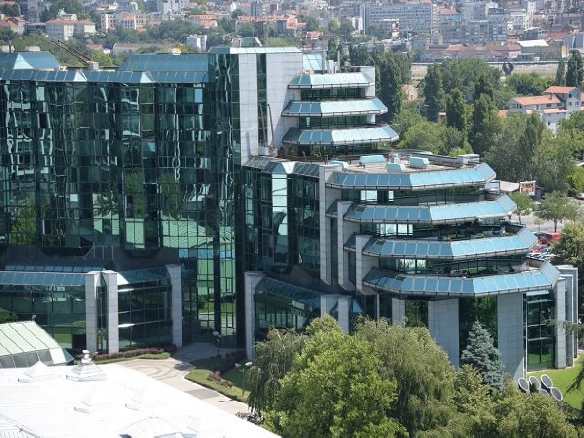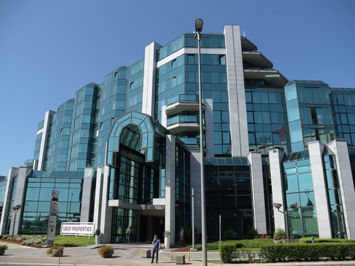 Modern and functional office buildings, surrounded by carefully maintained green areas and pedestrian paths.